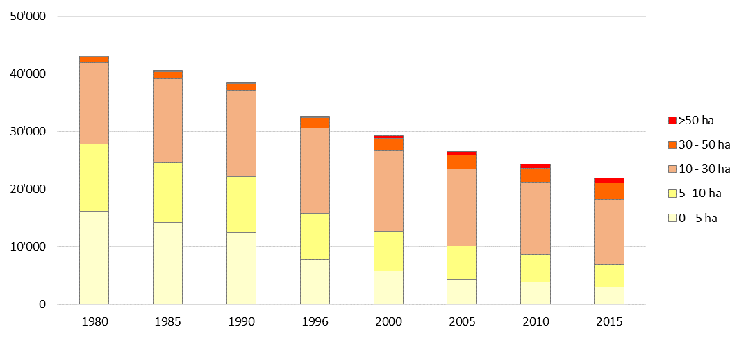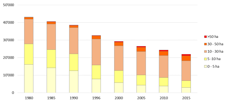 Abbildung: Anzahl und Grösse von landwirtschaftlichen Betrieben im Berggebiet zwischen 1980 und 2015. In diesem Zeitraum hat sich die Anzahl der Betriebe halbiert (Quelle: Landwirtschaftliche Strukturerhebung).
