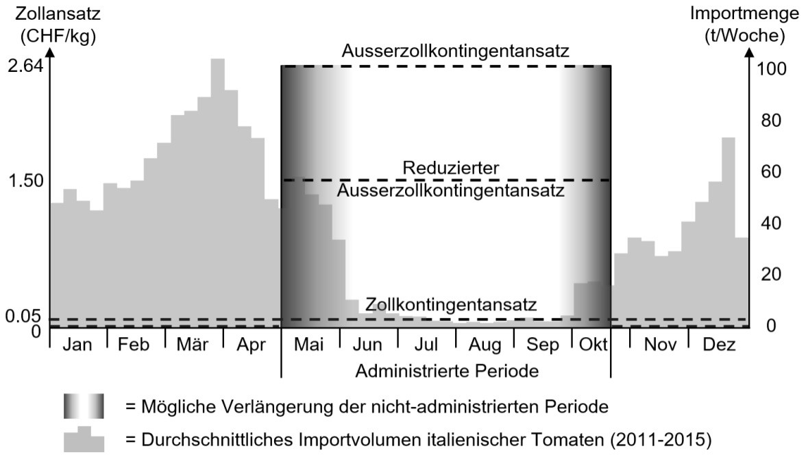 In der Schweiz, aber auch in anderen Ländern wie Norwegen, Südkorea und in der EU, werden saisonale Zollkontingente als Grenzschutzinstrument angewandt, um heimische Obst- und Gemüseprodukte vor ausländischer Konkurrenz zu schützen. Zollkontingente, oder auch Tariff Rate Quotas (TRQs), sind zweistufige Zölle mit einem niedrigen Zollsatz für Importe bis zu einem festgelegten Kontingentvolumen und einem höheren Zollsatz für alle nachfolgenden Importe. In ihrer saisonalen Variante wird dieses zweistufige Zollsystem nur angewandt, solange einheimische Produkte auf dem Markt sind; bei den meisten Obst- und Gemüsesorten also während der Sommermonate. Während dieser „administrierten Periode” wird ad-hoc jede Woche entschieden, ob und wie viele Importe zum günstigen Zollsatz erlaubt werden. Günstige Importe werden nur erlaubt, wenn die inländische Produktion nicht ausreicht, um die erwartete Nachfrage zu befriedigen. Im Rest des Jahres, sobald keine inländischen Produkte mehr auf dem Markt sind, werden nur noch die niedrigen oder gar keine Zölle mehr angewandt (siehe Abbildung).