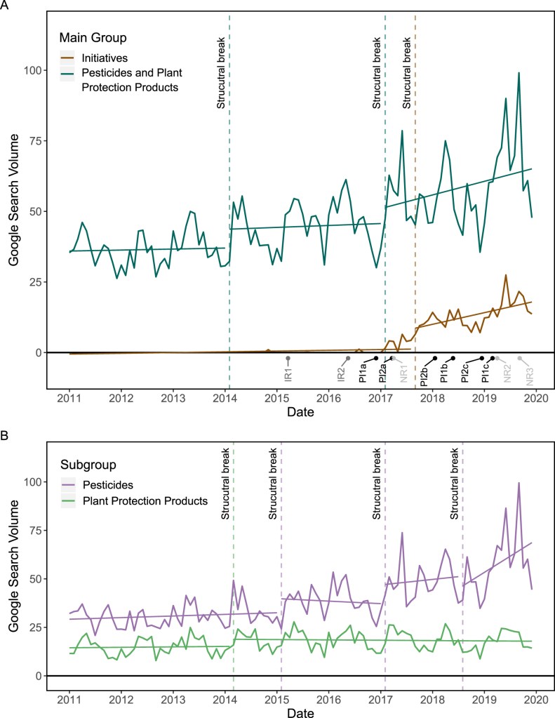 B (unteres Diagramm): Unterschiedliche Entwicklung der Such nach Pestiziden und Pflanzenschutzmitteln im gleichen Zeitraum. Die gestrichelten Linien (Strukturbrüche) stellen unterschiedliche Phasen dar, welche sich ex-post statistisch unterscheiden lassen.