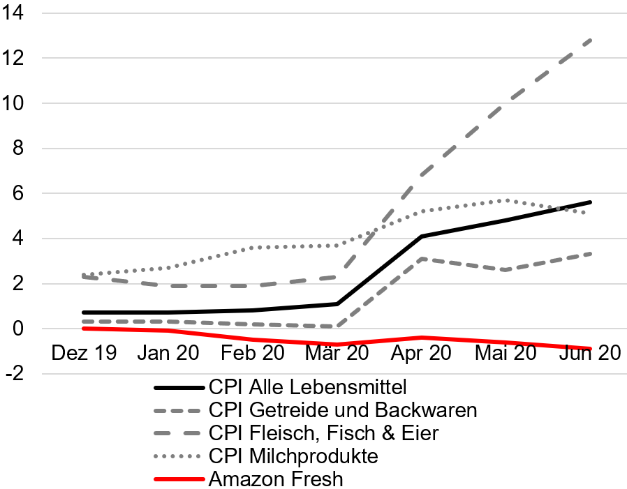 Da stellt sich die Frage, ob solche neuen, flexiblen Preis-Strategien einen Einfluss auf die gesamte Lebensmittel-Branche haben könnten. Hierzu haben wir uns die Preissetzung von Whole Foods Market angeschaut. Die US-amerikanische Bio-Supermarktkette wurde 2017 von Amazon übernommen. Seitdem werden die Produkte sowohl online über die Amazon Fresh Website, als auch offline über die Whole Foods Läden vertrieben. Es zeigt sich, dass trotz der Übernahme und des Online-Vertriebs hier die Preissetzung weiterhin traditionellen Mustern folgt: Whole Foods Preise werden seltener als einmal jährlich angepasst, und die wenigen beobachteten Preisänderungen sind häufig grössere Beträge, sowie temporäre Aktionspreise. Die Frequenz und Höhe der Preisanpassungen weisen auf eine ähnliche hohe Preisrigidität wie bei anderen Lebensmittel-Einzelhändlern hin. Zumindest bislang beschränkt Amazon seine neuartige, dynamische Preissetzung also auf den reinen Onlinehandel, bleibt im Multi-Channel Vertrieb aber den altbekannten Supermarkt-Preissetzungsmechanismen treu. Mindestens so bedeutsam wie die Übernahme von Whole Foods war für Amazon Fresh der Corona-bedingte Nachfrage-Anstieg in 2020. Eine weitere Studie untersucht daher das Preisniveau von Amazon Fresh während der Corona-Pandemie.1 Während der ersten Welle im Frühjahr 2020 ist der allgemeine US-Verbraucherpreisindex für Lebensmittel stark angestiegen. Im April 2020 waren Lebensmittel im Schnitt 4% teurer als im Vorjahr. Amazon Fresh hingegen behielt das niedrige, kompetitive Preisniveau bei. Im Vorjahresvergleich sanken die Amazon Fresh Preise sogar leicht, selbst in Segmenten wie Fisch und Fleisch, für die das Preisniveau im Rest des Landes aufgrund temporärer Verarbeitungsstopps und Lieferengpässen stark anstieg (Abbildung 2).