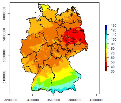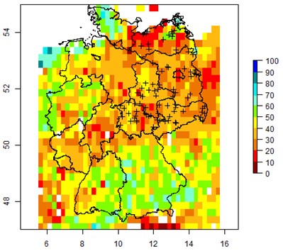 Abbildung 2: Modellierte Bodenfeuchte basierend Stationsdaten (DWD) in % der pflanzenverfügbaren Feldkapazität und ermittelt am 150ten Tag des Jahres 2015. Siehe Vroege et al. 2021