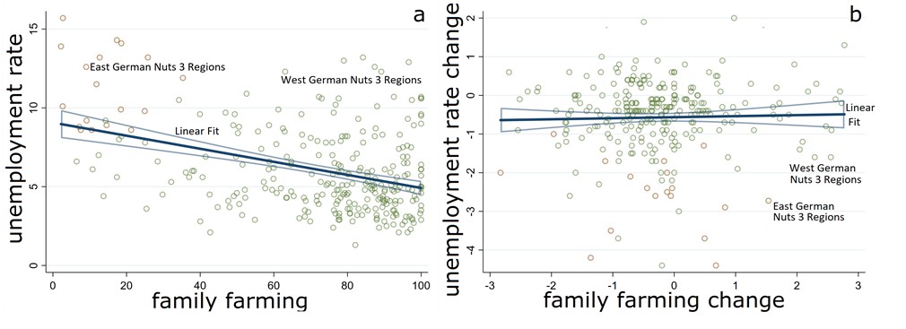 Unsere Datengrundlage sind FADN Daten auf Kreisebene von 2008 bis 2013. Wir finden, dass in Deutschland Regionen mit mehr Familienbetrieben weniger Arbeitslosigkeit haben (Abb.1a) und dies ist robust gegenüber vielen Kontrollvariablen. Betrachten wir allerdings Veränderungen über die Zeit, ein Setting im dem wir für noch viele weitere Störfaktoren kontrollieren können, so zeigt sich, dass ein Rückgang an Familienbetrieben nicht kausal zu mehr Arbeitslosigkeit führt (Abb.1b). Der Grund warum wir den starken Zusammenhang zwischen Familienbetrieben und Beschäftigungsquote sehen, sind regionale kulturelle Unterschiede.