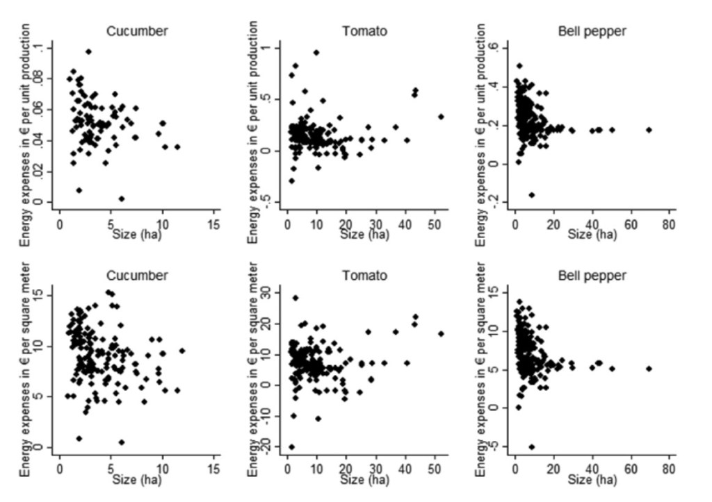 Abbildung 2. Zusammenhang zwischen Betriebsgrösse und Energieaufwand (in Euro pro produzierter Einheit (obere Reihe) und pro m2 (untere Reihe)) beim Anbau von Gurke, Tomate und Paprika (Los et al. 2021)