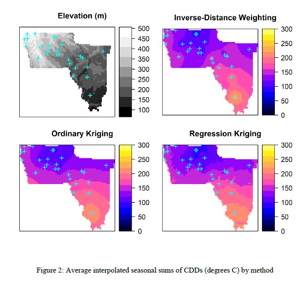 In einem kürzlich in der Fachzeitschrift Weather, Climate, and Society erschienenen Beitrag (Leppert et al., 2021) haben wir verschiedene sogenannte Interpolationsverfahren (siehe Abbildung 1) genutzt um die Temperatur am Betriebsstandort mit Hilfe von Daten mehrerer Wetterstationen die sich in der Nähe des Betriebes befinden zu approximieren und somit das Basisrisiko zu verringern. Hierbei werden alle verfügbaren Wetterstationsdaten gleichzeitig berücksichtigt, um die Temperatur in einer bestimmten Region abzubilden. Auf Basis dieser erzeugten täglichen Temperaturwerte haben wir eine Versicherungsauszahlung an besonders heißen Tagen simuliert und uns angeschaut, wie diese Auszahlung das Produktionsrisiko von Landwirten verringert hätte. Außerdem haben wir eine zweite Versicherung simuliert die eine Auszahlung auf Basis von einzelnen Wetterstationsdaten generiert. Für unsere Studie haben wir Wetter- und Maisertragsdaten aus den US-Staaten Illinois und Iowa genutzt.