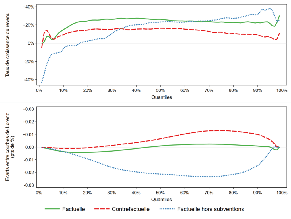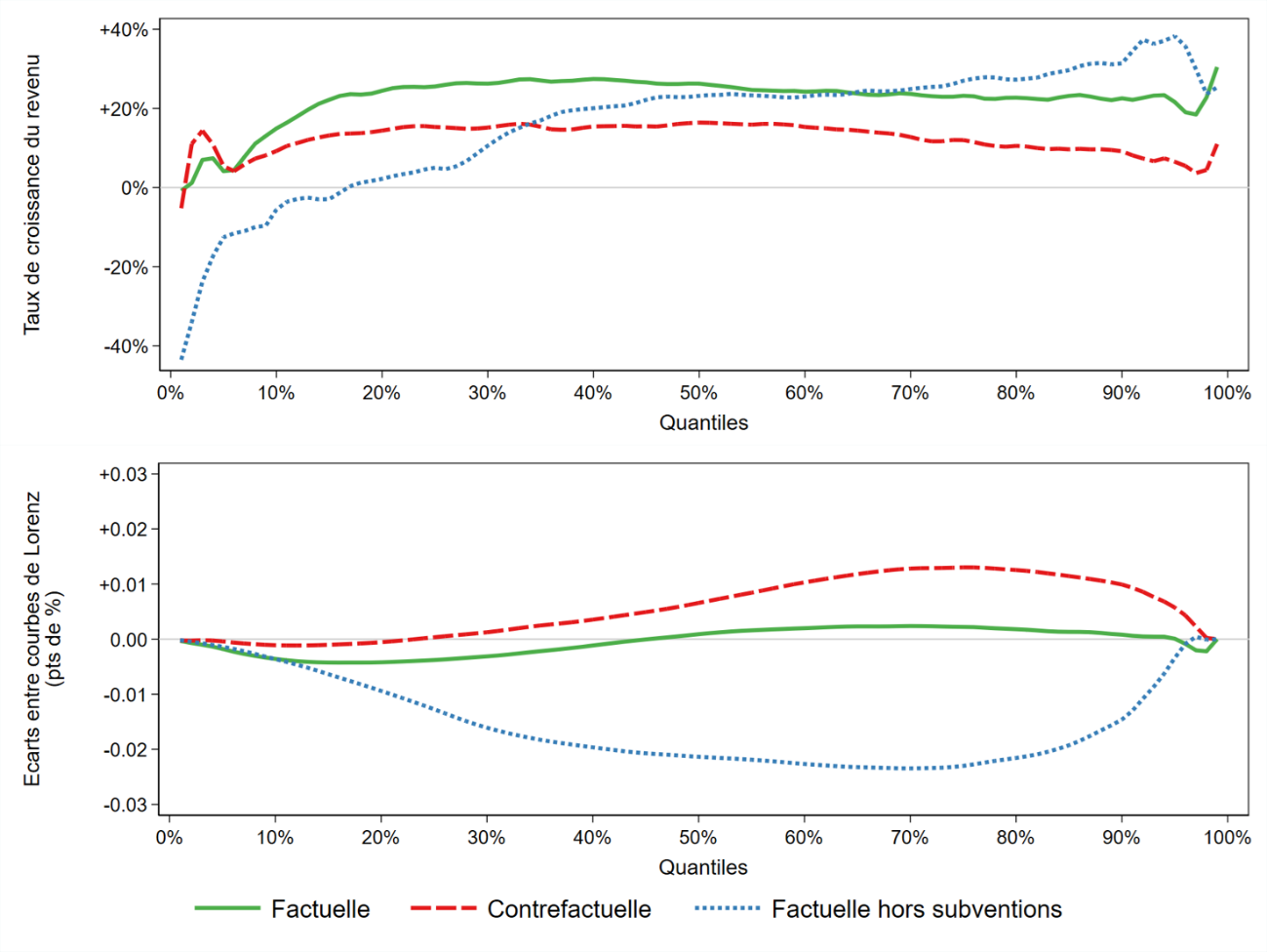 Les courbes factuelles obtenues en excluant les subventions du revenu (figure 1, courbes en pointillés) permettent d’analyser l’effet redistributif du soutien accordé dans le cadre de la PAC. Le revenu hors subventions présente ainsi des taux de croissance et une dynamique des inégalités nettement différents de ceux observés pour le revenu total, aides comprises. La courbe des taux de croissance du revenu hors subventions s’avère en effet globalement croissante, alors que celle du revenu total était pratiquement plate. Il en résulte que les différences entre courbes de Lorenz obtenues avec le revenu hors subventions sont négatives partout, alors que celles obtenues avec le revenu total n’étaient pas significativement différentes de zéro. Améliorant la croissance du revenu des quantiles inférieurs et freinant la croissance du revenu des quantiles supérieurs, les subventions accordées dans le cadre de la PAC ont donc permis de niveler les inégalités. Sur la période étudiée, ces subventions ont donc eu un rôle redistributif « progressif » en permettant que les inégalités de revenu total, aides comprises, n’augmentent finalement pas parmi les exploitations considérées.
