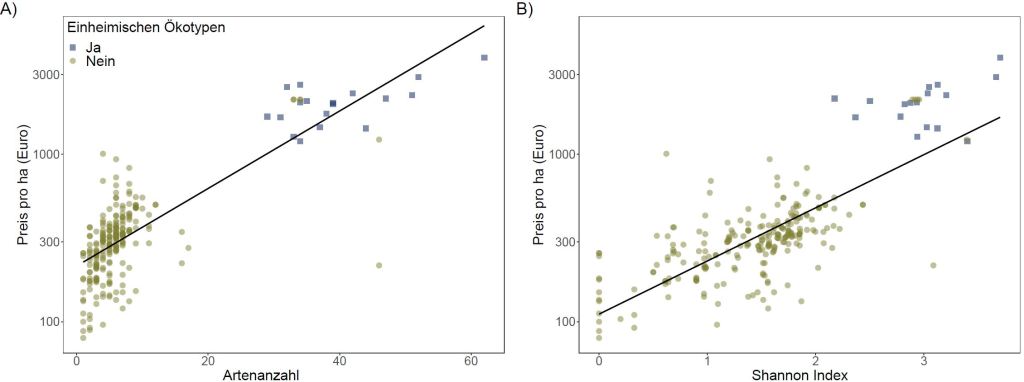 In einem kürzlich in der Fachzeitschrift Environmental Research Letters erschienenen Artikel (Schaub et al. 2021) haben wir den Zusammenhang von Artenvielfalt und den Preisen von Saatgutmischungen für die landwirtschaftliche Graslandnutzung und/oder für die Renaturierung von Grasland untersucht. Dafür haben wir 262 kommerziell erhältliche Saatgutmischungen betrachtet, die in der Schweiz und in Deutschland in sechs Online-Shops angeboten wurden. Neben der Artenvielfalt-Preis-Beziehung haben wir uns auch die Beziehung zwischen Preisen und anderen Eigenschaften der Saatgutmischungen angeschaut, wie zum Beispiel die Zusammensetzung der Mischungen und die Verwendung von einheimischen Ökotypen (d.h. Eignung für Renaturierungszwecke).