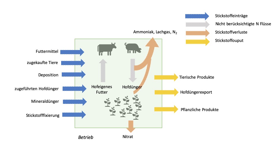 Für diese Studie wurde das agentenbasierte Agrarsektormodell SWISSland mit einer Hoftorbilanz ergänzt. Diese Bilanz summiert alle Stickstoffeinträge über zugekaufte Futtermittel, Mineraldünger, atmosphärische Einträge und Stickstofffixierung und stellt sie den Stickstoffgehalten von tierischen und pflanzlichen Produkten gegenüber. Die betriebsinternen N-Flüsse aus Hofdünger und eigenem Futter wurden nicht explizit modelliert.