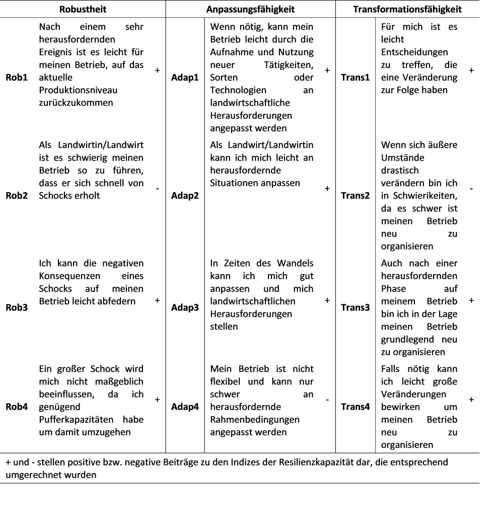 In der Literatur werden zwei Möglichkeiten, Resilienz zu bewerten beschrieben: (i) basierend auf vordefinierten Indikatoren (z. B. Cabell und Oelofse 2012) und (ii) basierend auf Wahrnehmungen (z. B. Grothmann und Patt 2005, Marshall und Marshall 2007, Jones und D ‚Errico 2019). Während die indikatorbasierte Resilienzbewertung in der Literatur eine breite empirische Basis hat, ist die auf Wahrnehmungen basierende Resilienzbewertung weniger gut untersucht. Darüber hinaus fehlt es an groß angelegten vergleichenden Bewertungen, die mehrere landwirtschaftlichen Systeme betrachten. Wir schließen diese Lücken. Die erhobenen Daten sind in Slijper et al. (2021) veröffentlicht.