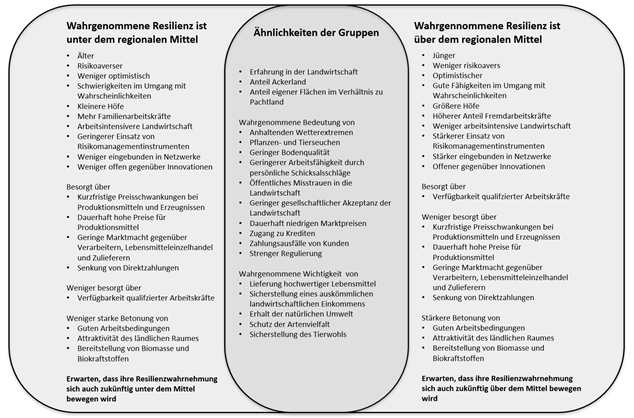 Wir haben diese Eigenschaften zwischen den beiden identifizierten Klassen verglichen. Wir fanden heraus, dass Landwirte, deren Resilienz über dem regionalen Durchschnitt liegt, im Allgemeinen jünger und weniger risikoavers sind, einen stärkeren Fokus auf die Bereitstellung öffentlicher Güter haben, eine höhere Anzahl Risikomanagementstrategien umsetzen, sowie eine aktivere Beteiligung an Netzwerken und eine größere Offenheit für Innovationen zeigen (Abb. 3). Obwohl wir keine Kausalität zwischen diesen Merkmalen und den offenbarten Resilienzwahrnehmungen feststellen können, ermöglichen unsere Ergebnisse die Entwicklung und Überprüfung von Hypothesen zu Determinanten und Folgen der Resilienzwahrnehmung.