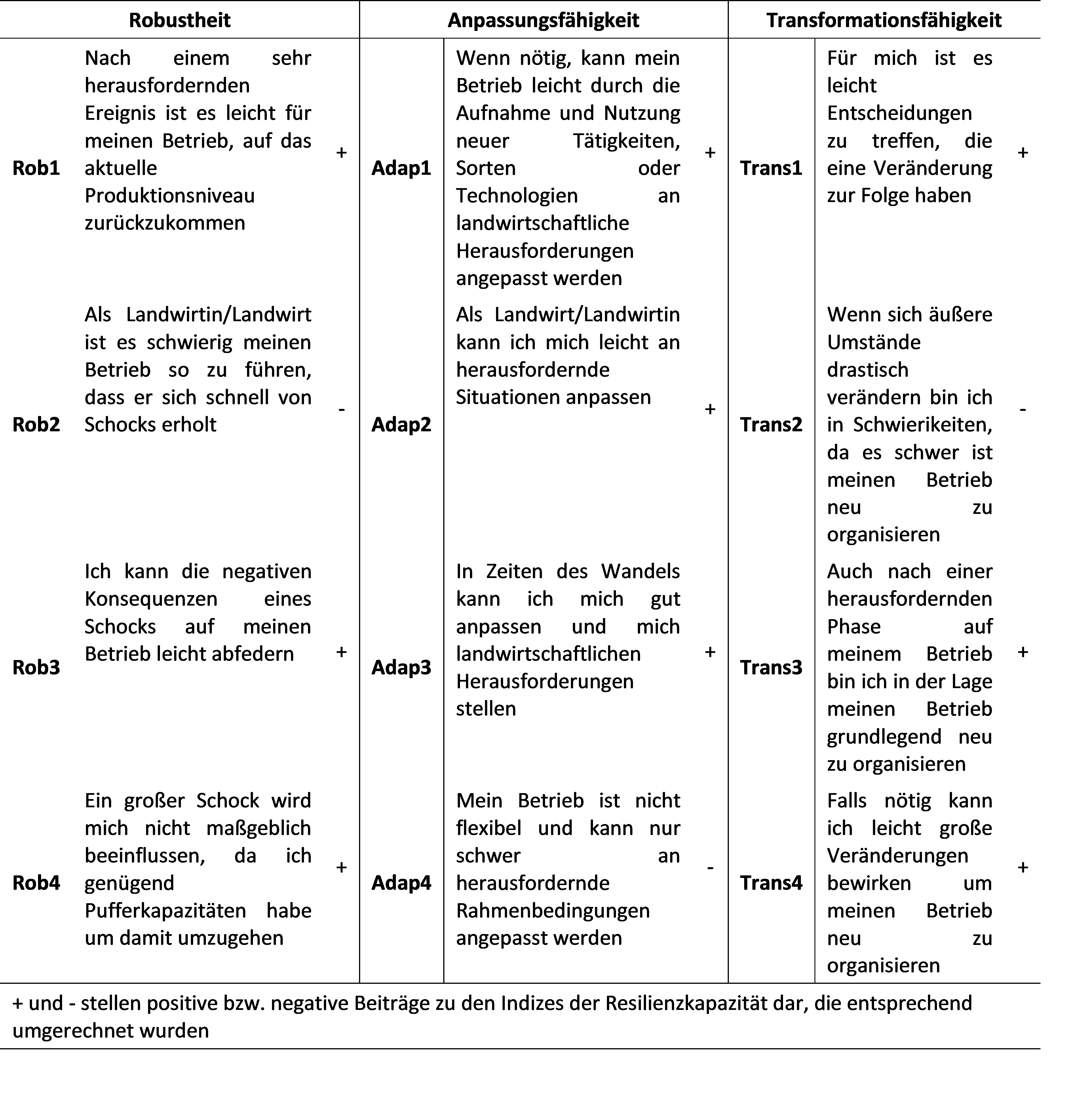 Tabelle 1. In die Betriebsbefragung aufgenommene Aussagen zur Bewertung der drei wahrgenommenen Resilienzfähigkeiten auf Basis der 7-Punkt-Likert-Skala (1=stimme überhaupt nicht zu … 7=stimme voll und ganz zu)