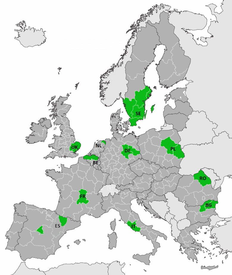 Abbildung 1 . Ausgewählte Agrarsysteme: BE ─ Milchviehhaltung in Flandern; BG ─ großflächiger Ackerbau in Nordostbulgarien; DE ─ Ackerbau mit Viehbestand in der Altmark; ES ─ extensive Schaf- und Rindviehhaltung in Huesca und Sierra de Guarradama; FR ─ extensive Rindviehhaltung in Bourbonnais; IT ─ Haselnussproduktion in kleinem Maßstab in Latium; NL ─ intensiver Ackerbau in Veenkoloniën; PL ─ Obst- und Gemüseanbau in der Region Masowien; RO ─ kleinbäuerliche gemischte Landwirtschaft im Nordosten Rumäniens; SE ─ hochwertige Eier- und Broilerproduktion in Südschweden; UK ─ Ackerbau in East Anglia.