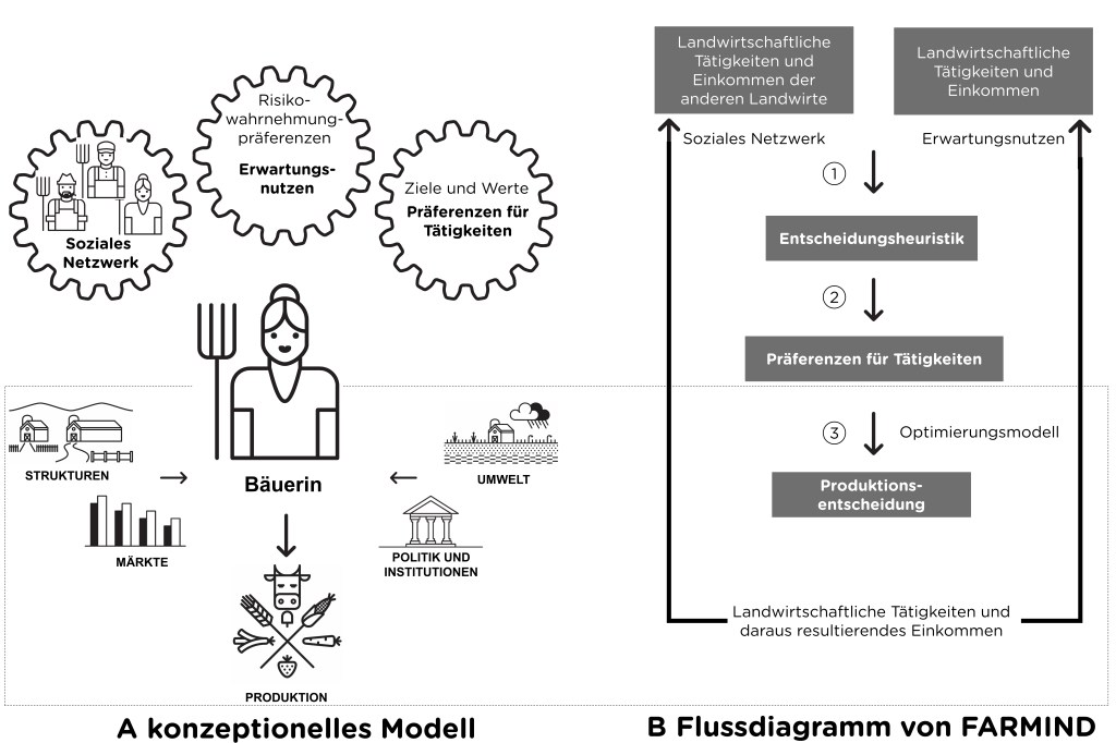 In einem vor kurzem in der Zeitschrift Journal of Agricultural Economics erschienen Artikel (Huber et al., 2022), haben wir einen neuen agentenbasierter Modellierungsansatz vorgestellt, der zur Schliessung dieser Forschungslücke beiträgt. Wir zeigen auf, wie verhaltensbezogene Faktoren mit einer bioökonomischen Modellierung, d.h., einer klassischen Kosten- Nutzen Abwägung in der landwirtschaftlichen Produktion, kombiniert werden können. Dieser Modellansatz mit dem Namen FARMIND (FARM INteraction and Decision-making), verbindet Risikoaspekte, Präferenzen für landwirtschaftliche Tätigkeiten sowie soziale Interaktionen mit einer einzelbetrieblichen Optimierung.