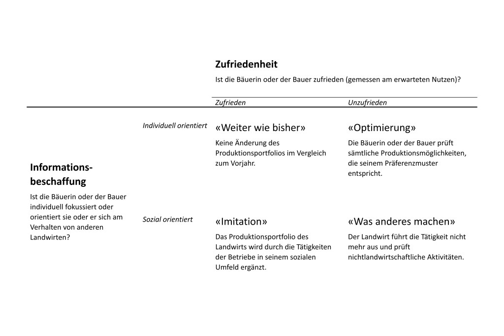Für welche Strategie sich der Agent (d.h. ein Betriebsleiter) entscheidet, hängt dabei von zwei Faktoren ab (Tabelle 1). Ist der Agent mit seiner Einkommenssituation zufrieden, dann wird er entweder weitermachen wie bisher oder allenfalls die Produktionsaktivitäten ihm bekannter Agenten berücksichtigen. Ob er zufrieden ist oder nicht, wird dabei mit Hilfe der sogenannten Erwartungstheorie («Cumulative Prospect Theory») simuliert. Dadurch trägt FARMIND der Tatsache Rechnung, dass die Rolle der Unsicherheit bei der Entscheidungsfindung der Landwirte von Landwirt zu Landwirt unterschiedlich und daher von Natur aus subjektiv ist. Der zweite Faktor ist, wie sensitiv der Agent auf Änderungen in seinem sozialen (bäuerlichen) Umfeld reagiert. Eine Bäuerin oder ein Bauer, dessen Verhalten stark auf Veränderungen in seinem Umfeld reagiert, wird in unserem Modell eher dazu neigen, andere Agenten zu imitieren oder «was anderes» zu machen». Individuell eingestellte Agenten hingegen machen was sie schon immer gemacht haben oder versuchen ihren Betrieb zu optimieren ohne, dass sie von Tätigkeiten anderer Agenten beeinflusst werden.
