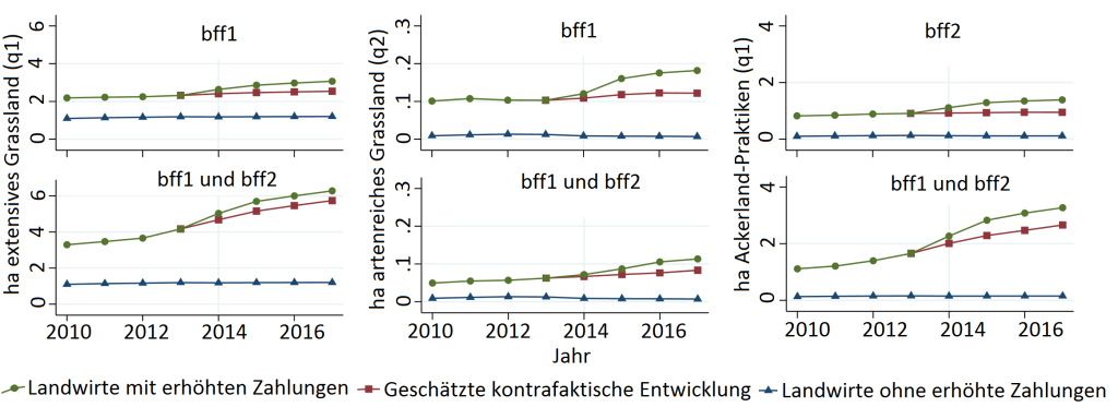 Wir nutzen dazu die Strukturdaten aller Schweizer Landwirtschaftsbetriebe von 2010 bis 2018 und eine Spezifität der Agrarreformetappe AP14/17. Die Reform hatte nämlich nicht sämtliche Zahlungen im Rahmen des Biodiversitätsprogramms erhöht. Es gab Unterschiede zwischen den Zonen und den einzelnen Massnahmen (beispielsweise zwischen Zahlungen für extensiv genutzte Wiesen im Berg und Talgebiet oder Massnahmen im Ackerbau wie Blühstreifen und Buntbrachen). Dieser Umstand konnten wir nutzen, um verschiedene Gruppen von Betrieben zu identifizieren: (1) Betriebe, für welche sich keine der Zahlungen erhöhte (unsere «Kontroll»-Gruppe), (2) Betriebe, bei denen sich jeweils die BFF1 oder die BFF2 Beiträge erhöhten und (3) Betriebe, für die sich beide Zahlungen erhöhten.