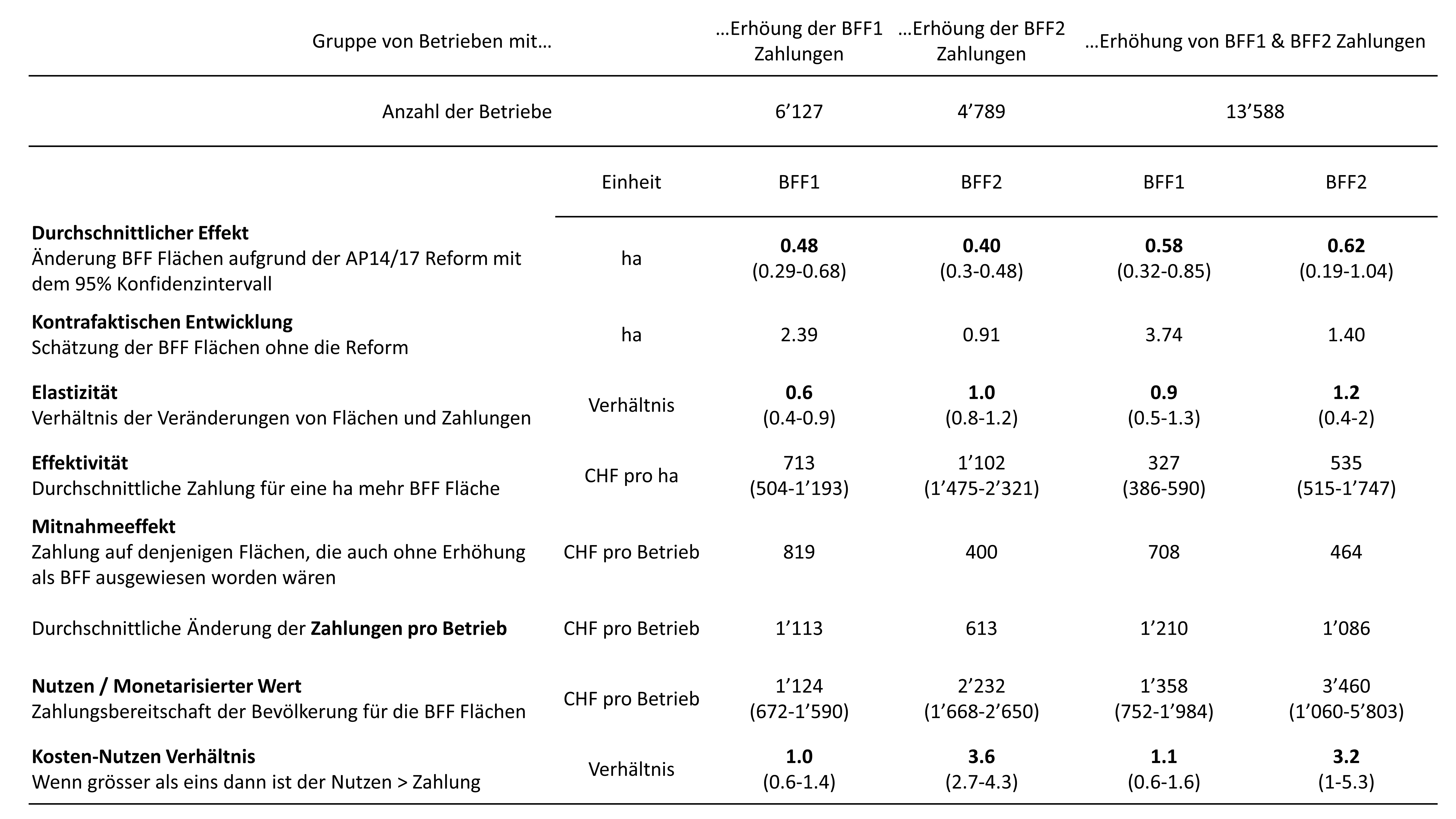 Unsere Ergebnisse machen aber auch deutlich, dass unseren Schätzungen eine grosse Variabilität zwischen den Betrieben zu Grunde liegt. Auch wenn wir für viele betriebliche Parameter kontrollieren können (wie beispielsweise für Betriebsgrösse, Arbeitskräfte, oder Zonen) so haben alle unsere ökonometrischen Schätzungen ein grosses Vertrauensintervall. Es wäre diesbezüglich sicher hilfreich, wenn nicht nur die Flächenangaben zur Beurteilung der Biodiversität, sondern tatsächliche Indikatoren für gemessene Biodiversität als Ergebnis der Zahlung in der Berechnung berücksichtigt werden könnten. Auch die Monetarisierung des Wertes der Biodiversitätsförderflächen ist mit einer grossen Unsicherheit behaftet – auch wenn die Meta-Studie für gewisse methodische Ausreisser korrigiert.