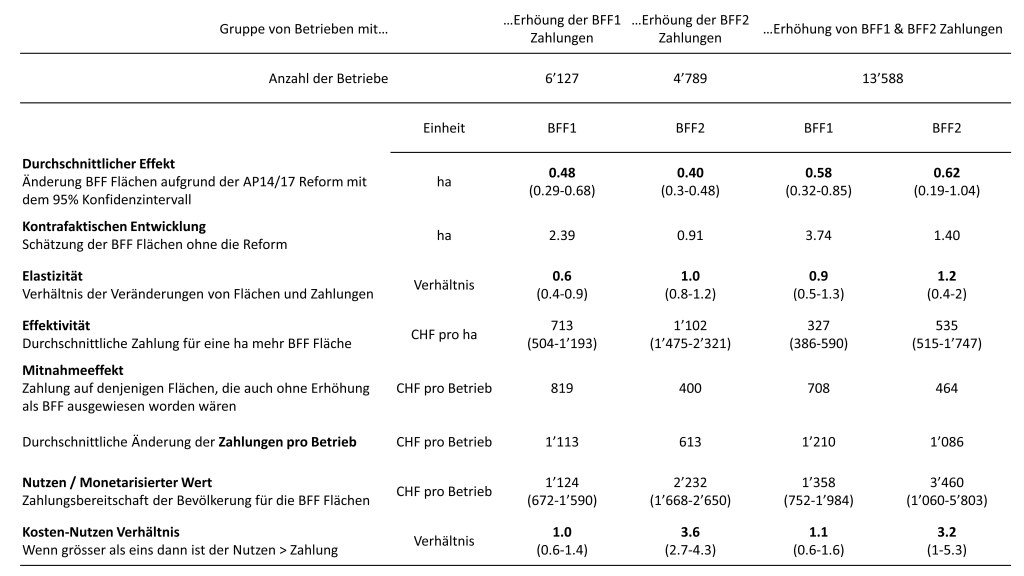 Die letzte erfolgreiche Agrarpolitikreform in der Schweiz (AP14/17) führte zu einer Anpassung und Erhöhung der Zahlungen für Biodiversitätsförderflächen (siehe z.B. Metz et al., 2021). Wir haben die Auswirkungen dieser Erhöhung evaluiert und die Investitionen in massnahmenorientierte (BFF1) und ergebnisorientierte Zahlungen (BFF2) verglichen. Wir finden, dass jeder investierte Franken in massnahmenorientiert Zahlungen mindestens denselben Wert an gesellschaftlichem Nutzen erbringt. Bei den ergebnisorientierten Zahlungen (BFF2) schätzen wir, dass für jeden investierten Franken, der Gesellschaft einen Nutzen von drei Franken entsteht.