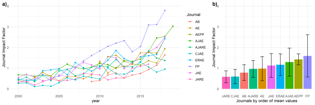 Abbildung 3 zeigt, dass die Impact Factors für die betrachteten Zeitschriften insgesamt gestiegen sind, allerdings nicht für alle in gleichem Maße. Insbesondere bei FP, AEPP und AJAE ist der Impact Factor erheblich gestiegen, während er bei anderen auf einem eher niedrigen Niveau geblieben ist.