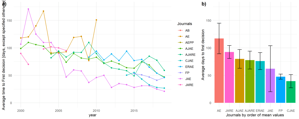 Abbildung 2: Zeit bis zur ersten Entscheidung nach Zeitschriften a) über die Zeit sowie b) im Mittel mit Varianz. Quelle: Finger et al. 2022.