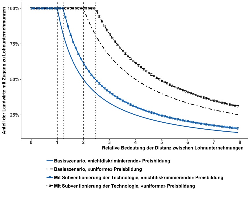 Die Unterscheidung der Linienformen illustrieren die Abdeckung des Marktes mit und ohne Subventionierung der Nutzung von Präzisionslandwirtschaft. Aus unseren Analysen lässt sich nun ableiten, dass die Distanz, in welcher Wettbewerb zwischen den Lohnunternehmungen herrscht, mit einer «uniforme» Preisbildung doppelt so gross ist, wie eine «nichtdiskriminierende» Preisbildung. Mit zunehmender Distanz (und den dazugehörigen Transportkosten) nimmt die Abdeckung des Markts aufgrund der zunehmenden Monopolsituation kontinuierlich ab. Eine Subvention ermöglicht eine Aufrechterhaltung des Wettbewerbs, ihre Bedeutung wird aber mit zunehmender Distanz kleiner (der Abstand der Kurven zwischen der Situation mit und ohne Subvention wird kleiner).