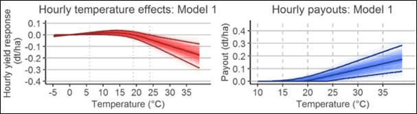 Abbildung 1: Geschätzte stündliche Temperatureffekte auf Weizenerträge (links in rot) und resultierende Auszahlungen (rechts in blau). Innere Linie zeigt geschätzter Temperatureffekt (links) oder Auszahlung (rechts) und äussere Linien illustrieren deren statistische Unsicherheit.