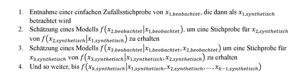 Die Verwendung synthetischer Daten geht auf Rubin (1993) zurück. Synthetische Daten bestehend aus k Variablen können durch Imputationsverfahren allgemein mit den folgenden Schritten erzeugt werden (Faisal, Hutson and Mohammed 2021):