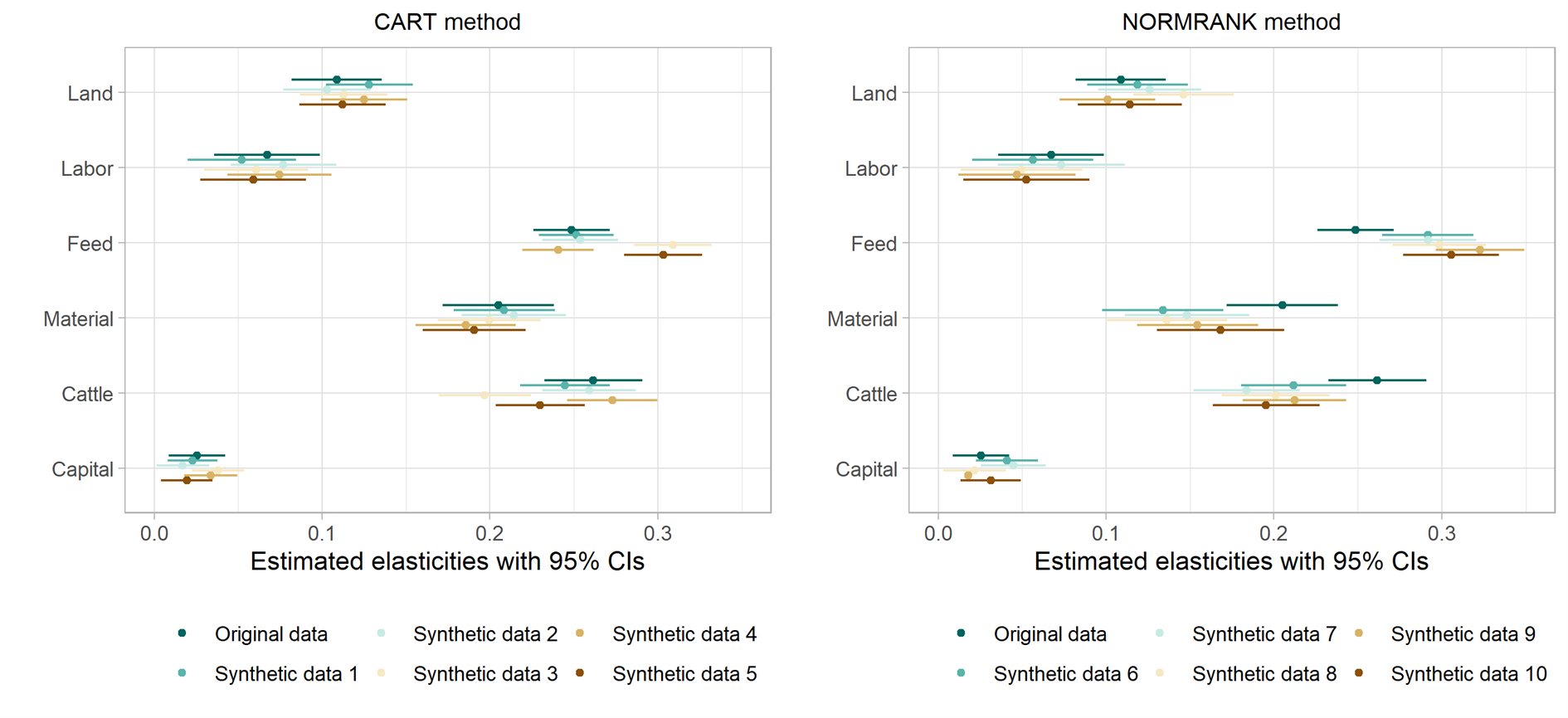 Wir präsentieren hier Ergebnisse für Datensatz 1. Die Ergebnisse zeigen, dass sich insbesondere die CART Methode sehr gut eignet, synthetische Daten für Produktionsanalysen zu generieren. Abbildung 1 stellt exemplarisch die geschätzten Outputelastizitäten für jeweils fünf synthetische Datensätze generiert mit den CART (links) und NORMRANK (rechts) Methoden im Vergleich zu den mit dem Originaldatensatz erhaltenen Ergebnissen dar. Die 95%-Konfidenzintervalle überlappen jeweils sehr stark basierend auf der CART Methode, während die NORMRANK Methode zu grösseren Abweichungen – insbesondere bei den Elastizitäten des Futters, Materials und Viehbestandes – führt.