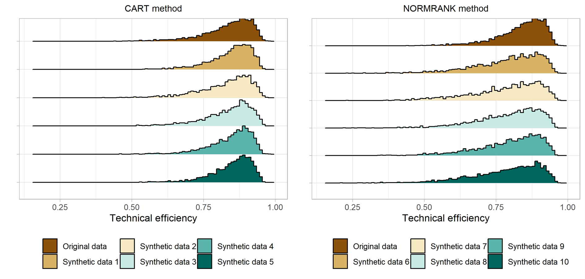 Ein ähnliches Bild zeigt sich hinsichtlich der technischen Effizienzen (siehe Abbildung 2): Der durchschnittliche Wert von 0,84 auf Grundlage der Originaldaten legt nahe, dass landwirtschaftliche Betriebe der Stichprobe ihre Produktion im Durchschnitt um 16 % steigern könnten, ohne den Input-Einsatz zu verändern. Im Vergleich dazu werden Effizienzwerte werden leicht unterschätzt und zeigen höhere Standardabweichungen sowie niedrigere Mindestwerte, wenn die synthetischen Daten mit der NORMRANK-Methode generiert werden. Bei der CART-Methode hingegen ist die Verteilung der TE-Scores sehr ähnlich zu derjenigen, die sich mit den Originaldaten ergibt.