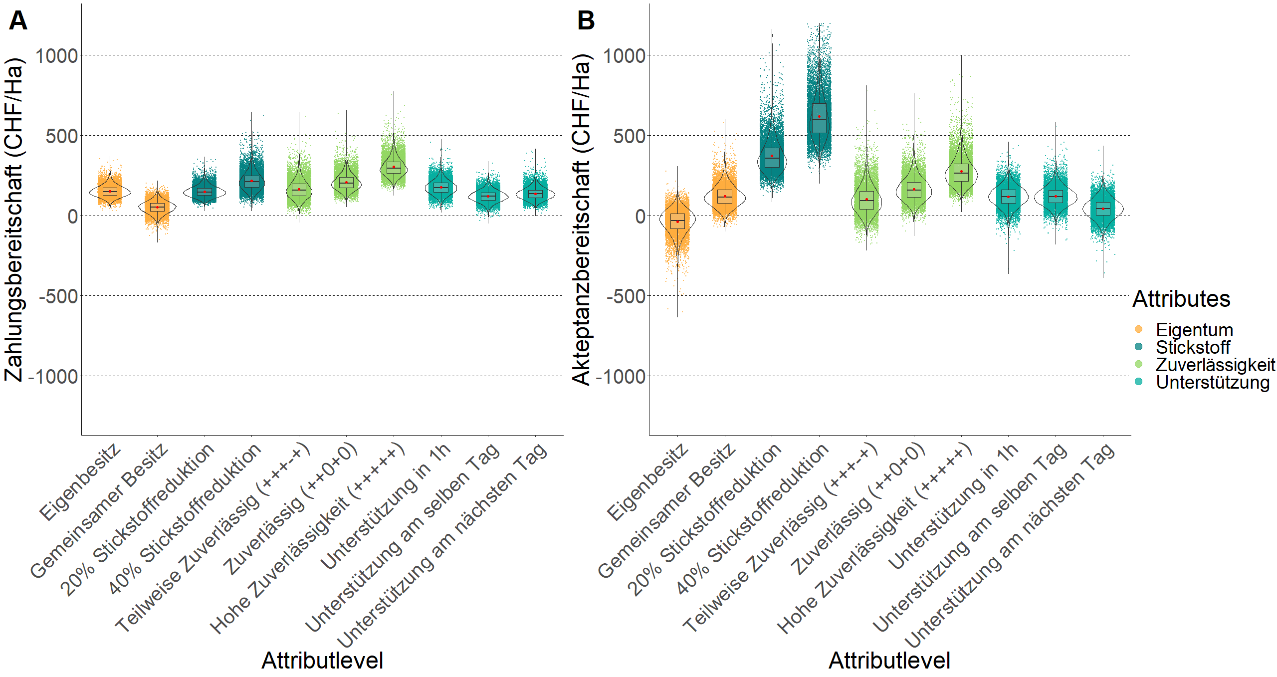 Unsere Ergebnisse zeigen, die Landwirtinnen und Landwirte bevorzugen Technologien mit hoher Zuverlässigkeit und einem hohen Stickstoffreduktionspotenzial. Die Zahlungsbereitschaften für einzelnen Attribute variieren dabei stark (Abbildung 2). Zum Beispiel wären die Landwirtinnen und Landwirte bereit, 296 CHF/ha/Jahr für eine Technologie zu zahlen, die über die Jahre hinweg stabile Ergebnisse liefert. Für eine Technologie, die den Stickstoffeinsatz um 40% reduzieren kann, beträgt die Zahlungsbereitschaft 210 CHF/ha/Jahr. Die Schätzungen der marginalen Akzeptanzbereitschaft deuten darauf hin, dass die Landwirtinnen und Landwirte den höchsten Ausgleich für die Stickstoffreduzierung fordern. Sie sind bereit, für eine Entschädigung von 356 CHF/ha/Jahr den Stickstoff um 20 % zu reduzieren, während sie für eine 40 %ige Stickstoffreduktion eine Entschädigung in Höhe von 598 CHF/ha/Jahr erwarten. Im Vergleich fordern die Landwirtinnen und Landwirte demnach eine deutlich höhere Entschädigung, als sie für dieselbe Umwelteigenschaft der Technologie zu zahlen bereit wären. Ein möglicher Grund dafür ist, dass Landwirtinnen und Landwirte, wenn sie zu ihrer Akzeptanzbereitschaft befragt, werden der Ansicht sind, dass sie einen öffentlichen Umweltnutzen erbringen.