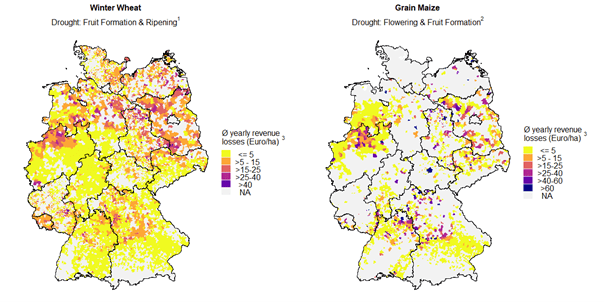 Abbildung 1. Extreme Sommertrockenheit – geschätzte durchschnittliche jährliche Ertragsverluste in Euro/ha für Winterweizen und Körnermais