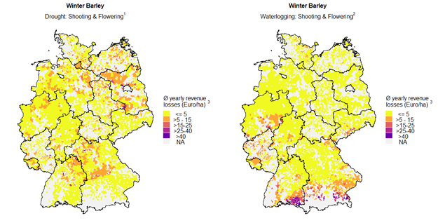 Abbildung 2. Extreme Frühjahrstrockenheit und Frühjahrs-Staunässe – geschätzte durchschnittliche jährliche Ertragsverluste in Euro/ha für Wintergerste