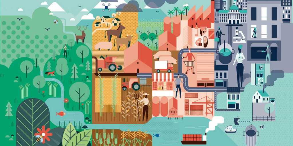 Natürliche Ressourcen, Landwirtschaft, Verarbeitung, Produktion und Handel – und nicht zuletzt unser aller Konsum spielen Ernährungssystem zusammen. (Illustration: WFSC)