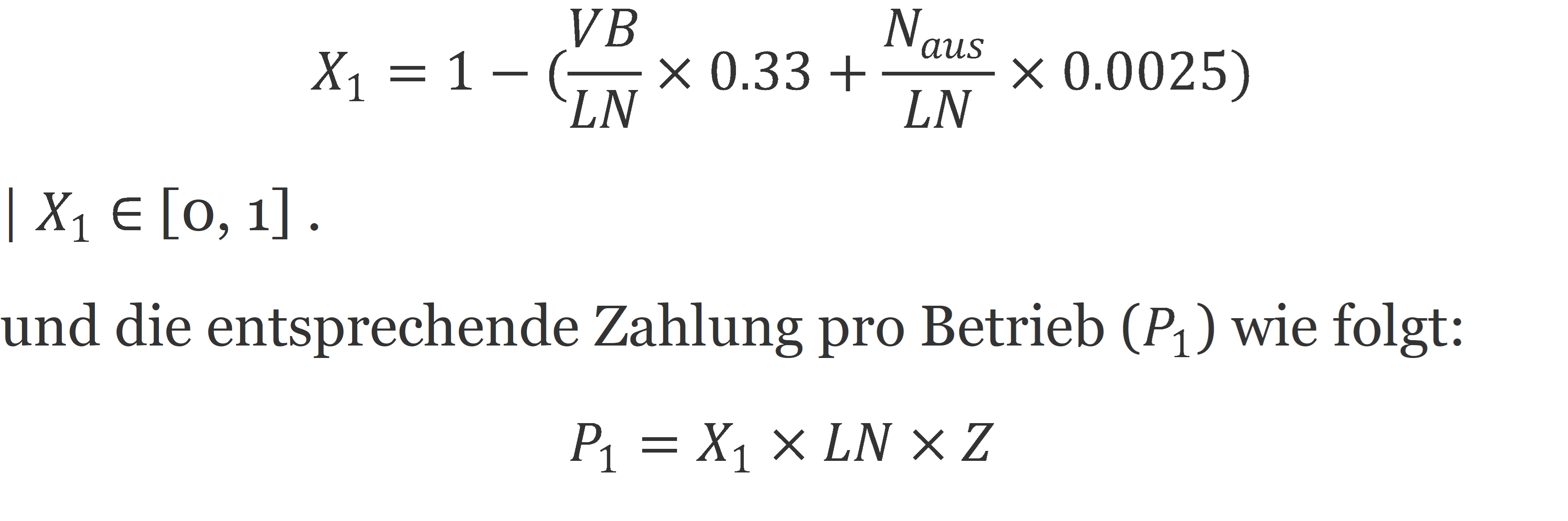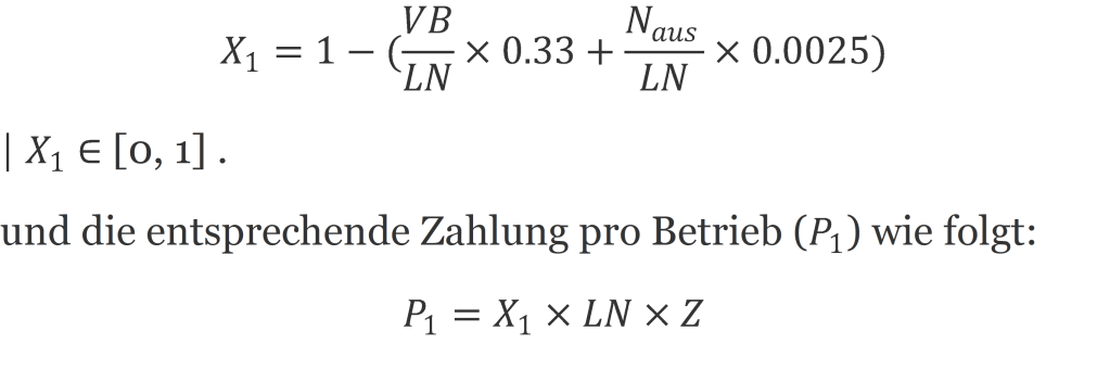 Wobei VB der landwirtschaftliche Viehbestand des Betriebs (in GVE) ist; LN die landwirtschaftlich genutzte Fläche (in ha); Naus die Menge des ausgebrachten (mineralischen und organischen) Stickstoffs (in kg); Z der Zahlungsansatz für Nährstoffe & Klima. Dieser wurde anhand von Schadenskosten geschätzt und beträgt CHF 3’100/ha.