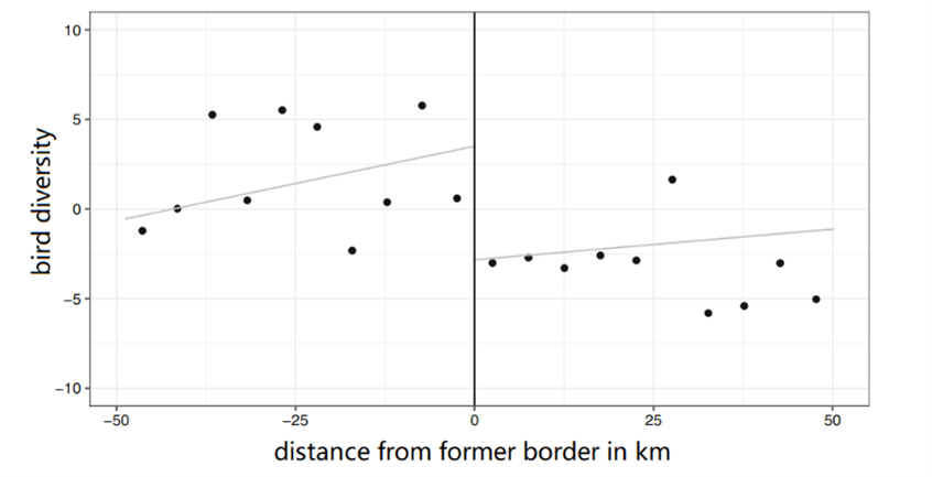Andere Beispiele für die Anwendung eines Regressionsdiskontinuitätsdesign sind Politiken, die nur bis zu einer klaren Grenze Implementiert wurden, und somit Sprünge genau an dieser Grenze anzeigen, welchen Effekt die Politik hatte (Asher and Novosad, 2020, Jones et al., 2022, Pan et al., 2018). Ein anderes Beispiel ist die historische Teilung Deutschlands in Ost und West, was zu permanent anderen landwirtschaftlichen Strukturen geführt hat. An der historischen Grenze kann man nun den Effekt von bäuerlicher (im Westen) und nicht-bäuerlicher Landwirtschaft (im Osten) auf landwirtschaftliche Praktiken und Biodiversität quantifizieren. So analysieren Noack et al. (2021), wie Biodiversität (Vogelpopulationen) an der ehemaligen innerdeutschen Grenze springen, und Wuepper et al. (2020b) nutzen diese Grenze, um zu analysieren ob und wie Familienbetriebe nachhaltiger produzieren. Wuepper et al. (2020b) finden, dass sich die beiden Seiten der Grenze nicht klar in der Nachhaltigkeit ihrer Praktiken unterscheiden, aber Noack et al. (2021) finden, dass die grossen strukturellen Unterschiede der beiden Seiten zu einer deutlich höheren Vogeldiversität auf der kleinstrukturierteren westlichen Seite führt (siehe Abbildung 2).