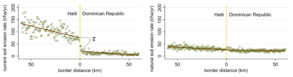 Ein illustratives Beispiel für die Anwendung des Regressionsdiskontinuitätsdesigns ist die Studie von Wuepper et al. (2020). Dort wurde untersucht, wie wichtig Länder (und ihre Institutionen, Politiken etc.) für die globale Rate der Bodenerosion sind. Das Problem ist, dass sich Länder zwar klar bei ihrer Bodenerosion unterscheiden (Korrelation), aber neben einem direkten Effekt (Kausalität) auch noch viele andere Unterschiede zwischen Ländern bestehen (Niederschlag, Bodentypen, Temperatur, Topografie). Um also quantifizieren zu können, wie sehr die Länder direkt ihre Bodenerosion beeinflussen, benutzen Wuepper, et al. (2020) eine Regressionsdiskontinuitätsanalyse für die sie sich bei allen Ländern auf der Welt nur auf Gebiete in der Nähe von Ländergrenzen konzentrieren und statistisch untersuchen, ob es genau an den Ländergrenzen abrupte Sprünge in der Bodenerosion gibt, die man nicht mit Temperatur, Regen, Bodentypen, oder Topografie erklären kann, sondern nur damit, dass eine Seite in einem land liegt und die andere Seite in einem anderen Land. Abbildung 1 zeigt das Beispiel von Haiti und der Dominikanischen Republik. Die Abbildung auf der linken Seite zeigt, wie die Bodenerosion generell nahe der Grenze ähnlicher ist als weiter weg (aufgrund natürlicher Faktoren) und es zusätzlich einen markanten Sprung an der Grenze gibt (der „Länder-Effekt“). Die rechte Seite der Abbildung zeigt eine Modellierung der natürlichen Bodenerosion. Diese ist generell viel niedriger und zeigt keinen Sprung an der Grenze. Dies wurde für alle Ländergrenzen gemacht und so quantifiziert, wie sehr Länder generell die globale Bodenerosion beeinflussen.