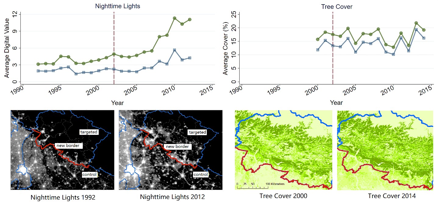 Wir stellen auch die verschiedenen Arten und Weiterentwicklungen von Regressionsdiskontinuitätsanalysen mit grosser Relevanz für agrarpolitische Analysen vor. Besonders relevant ist dabei die Differenz-in-Diskontinuitäten-Analyse (Differences in Discontinuities). Diese nutzt aus, dass es viele Beobachtungen über einen längeren Zeitraum (Paneldaten) gibt und analysiert, wie sich eine Diskontinuität z.B. durch einen Politikeingriff verändert. Ein gutes Anwendungsbeispiel ist die Studie von Garg and Shenoy (2021). In Indien wurden ein neuer Bundesstaat gegründet und mit vielen Förderprogrammen bedacht, die nachhaltiges Wirtschaftswachstum bewirken sollten. Die Analysen von Garg and Shenoy (2021) zeigen der Tat, dass es bis zur neuen Grenzziehung die jährliche Veränderung von nächtlicher Beleuchtung (ein guter Proxy für wirtschaftliche Entwicklung) auf beiden Seiten der neuen Grenze parallel anwuchs , aber nach Ziehung der Grenze, die Seite mit den neuen Politiken deutlich schnelleres Wachstum zeigte (linke Seite von Abbildung 3). Dies hatte keine Implikationen für Abholzung: die örtlichen Wälder wurden trotz der wirtschaftlichen Veränderungen nicht beeinflusst (rechte Seite von Abbildung 3).