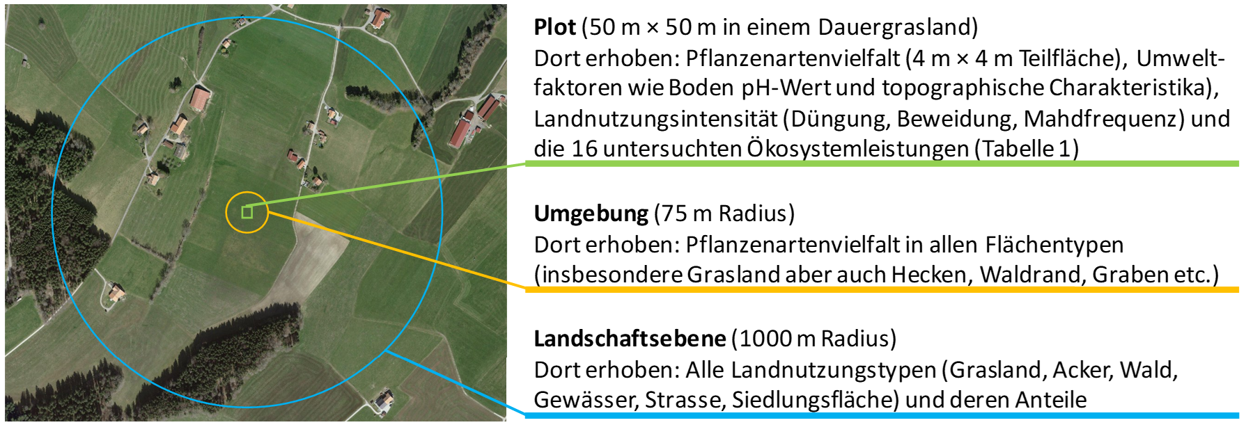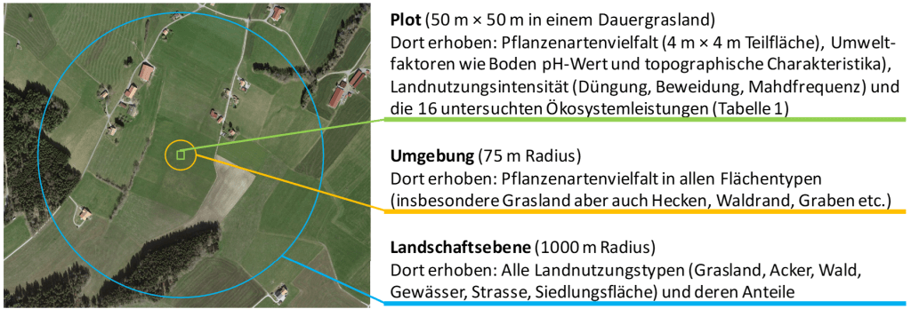 Besonders interessant an der vorliegenden Studie ist, dass nicht nur der Einfluss der lokalen Pflanzendiversität, also der Vielfalt der Pflanzen im jeweils untersuchten Graslandbestand, sondern auch die Pflanzendiversität in der jeweiligen Umgebung studiert wurde. Hierfür wurde in einem Radius von 75 m um die Mitte jeder Untersuchungsfläche die Vielfalt der Pflanzen in allen Lebensräumen und Nutzungstypen bestimmt (Abbildung 1). Es zeigte sich, dass die Pflanzenvielfalt sowohl des Bestands wie auch der direkten Umgebung wichtig für viele Ökosystemleistungen ist (Le Provost et al. 2022).