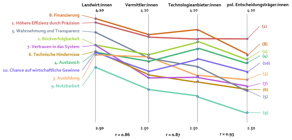Abbildung 2: Wahrnehmung der Wichtigkeit jedes Konzepts der Präzisionslandwirtschaft durch die einzelnen Akteursgruppen. Die Bewertungen (1 bis 5, von weniger bis sehr wichtig) spiegeln den Durchschnitt der Bewertungen für jede Aussage innerhalb eines Konzept-Clusters wider. R-Werte geben an, wie ähnlich sich zwei soziale Gruppen sind.