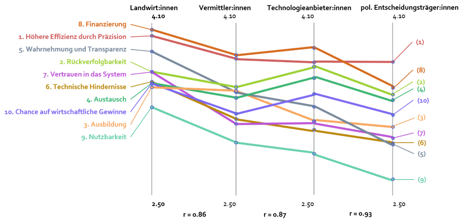 Abbildung 2: Wahrnehmung der Wichtigkeit jedes Konzepts der Präzisionslandwirtschaft durch die einzelnen Akteursgruppen. Die Bewertungen (1 bis 5, von weniger bis sehr wichtig) spiegeln den Durchschnitt der Bewertungen für jede Aussage innerhalb eines Konzept-Clusters wider. R-Werte geben an, wie ähnlich sich zwei soziale Gruppen sind.