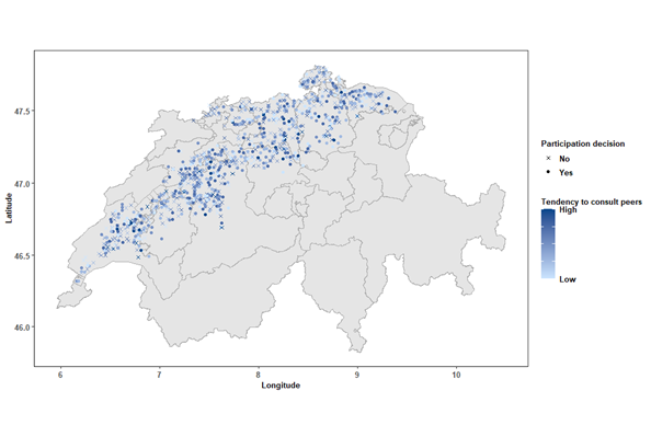 Unsere Analysen beruhen auf den Umfragedaten von Möhring & Finger (2022) mit 1.029 Weizenproduzenten der IP Suisse. Die Daten wurden in einer Umfrage im Dezember 2019 bis Januar 2020 erhoben, in denen Landwirte unter anderem angaben, ob sie auf pestizidfreie Weizenproduktion umgestellt haben, oder dies in den kommenden Jahren vorhaben. Wir untersuchen, ob und in welchem Umfang die Entscheidungen benachbarter Landwirte für den Wechsel zu pestizidfreien Weizenproduktionssystemen relevant sind, und inwiefern Merkmale benachbarter Betriebe, z.B. bzgl. Erfahrungen, Einstellungen oder vorhandene Maschinen, die Entscheidungen teilzunehmen beeinflussen.