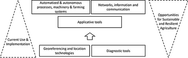 Digitale Innovationen werden in fünf Kategorien zusammengefasst (Abbildung 1): (i) Georeferenzierungs- und Ortungstechnologien (z.B. GPS), (ii) Diagnosewerkzeuge (z.B. Sensoren, Fernerkundung), (iii) Anwendungswerkzeuge (die Nutzung der gesammelten Informationen für angepasstes Management, z.B. Precision Farming), (iv) automatisierte und autonome Prozesse, Maschinen und landwirtschaftliche Systeme (z.B. autonome Roboter) und (v) Netzwerke, Information und Kommunikation (z.B. durch Vernetzung von Maschinen, Anwendungen aber auch Akteuren). Digitale Innovationen in den Kategorien (i) und (ii) sind momentan bereits stärker verbreitet. Das volle Potential für Nachhaltigkeit und Resilienz wird jedoch erst durch die Nutzung der Technologien auch in Kategorien (iii)-(v) realisiert.