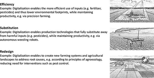 Abbildung 2. Die Digitalisierung kann durch Effizienz, Substitution und Redesign zu nachhaltigeren landwirtschaftlichen Systemen beitragen.