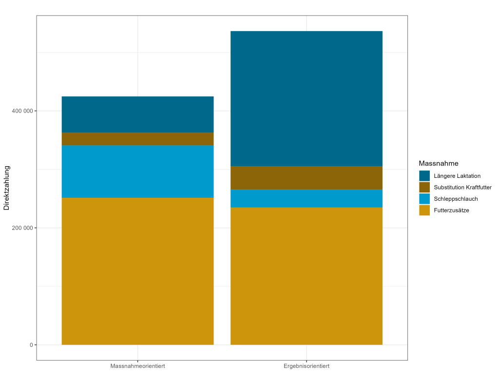 Eine längere Lebensdauer reduziert die Kosten auf den meisten Betrieben. Es braucht also nur einen geringen finanziellen Anreiz, um ansonsten veränderungsunwillige Landwirtinnen und Landwirte zur Umsetzung zu bewegen. In solch einem Fall kann eine auf die spezifischen Eigenschaften einer Massnahme zugeschnittene Zahlung (massnahmenorientiert) insgesamt zu tieferen öffentlichen Ausgaben führen als eine einheitliche (höhere) ergebnisorientierte Zahlung. Das kann man erkennen, wenn man sich die Kosten für die längere Laktation in der Abbildung 1 wegdenkt. In diesem Fall sind nämlich die staatlichen Ausgaben, welche durch die massnahmenorientierten Zahlungen entstehen, für die verbleibenden Massnahmen höher als im Fall einer ergebnisorientierten Zahlung.