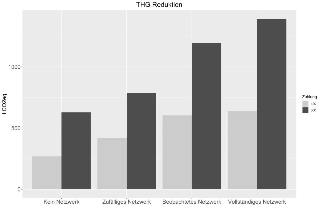 Damit wir den Effekt des Netzwerkes vollständig evaluieren konnten, erhöhten wir anschliessend die Zahlung in unseren Simulationen so lange bis die Emissionen ohne die Berücksichtigung sozialer Netzwerke gleich hoch waren wie in den Simulationen mit 120 Franken und dem beobachteten sozialen Netzwerk. Auf diese Weise konnten wir die für Klimaschutz notwendige Zahlung mit und ohne soziale Netzwerke für das gleiche Reduktionsniveau miteinander vergleichen.