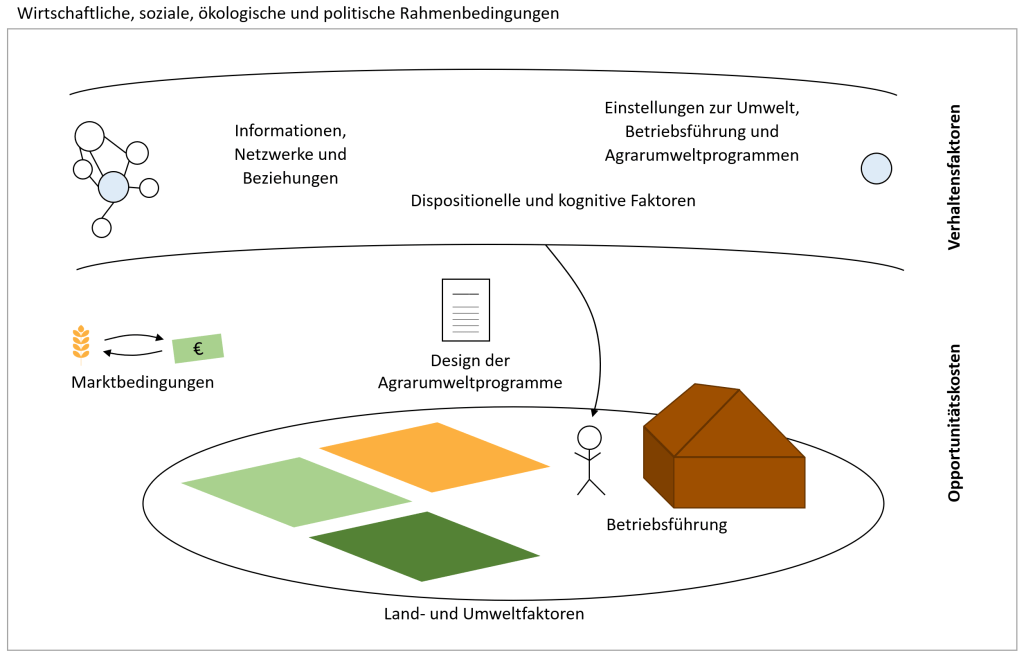 Um (ambitionierte) Agrarumweltprogramme so zu gestalten, dass Landwirt*inne daran teilnehmen verlangt ein umfassendes Verständnis welche Faktoren mit der Teilnahme in Beziehung stehen. Hier spielen besonders Verhaltensfaktoren und Opportunitätskosten eine besondere Rolle. Wir definieren Verhaltensfaktoren als die kognitiven, emotionalen, persönlichen und sozialen Faktoren, die das menschliche Verhalten beeinflussen (z.B. Umwelteinstellungen und Vertrauen zu anderen oder in die Politik) (Dessart et al., 2019). Unter Opportunitätskosten verstehen wir den entgangenen Nutzen umweltfreundlicher Praktiken im Vergleich zu alternativen Flächennutzungen und Praktiken, z.B. aufgrund geringerer Erträge oder eines höheren Arbeitsaufwands.