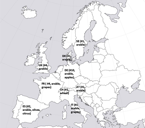Abbildung 2. Verteilung der identifizierten Studien zu den wirtschaftlichen Auswirkungen eines Glyphosatverbots in Europa (berücksichtigte Anbausysteme in Klammern). Die Abbildung basiert auf http://www.freeworldmaps.net.
