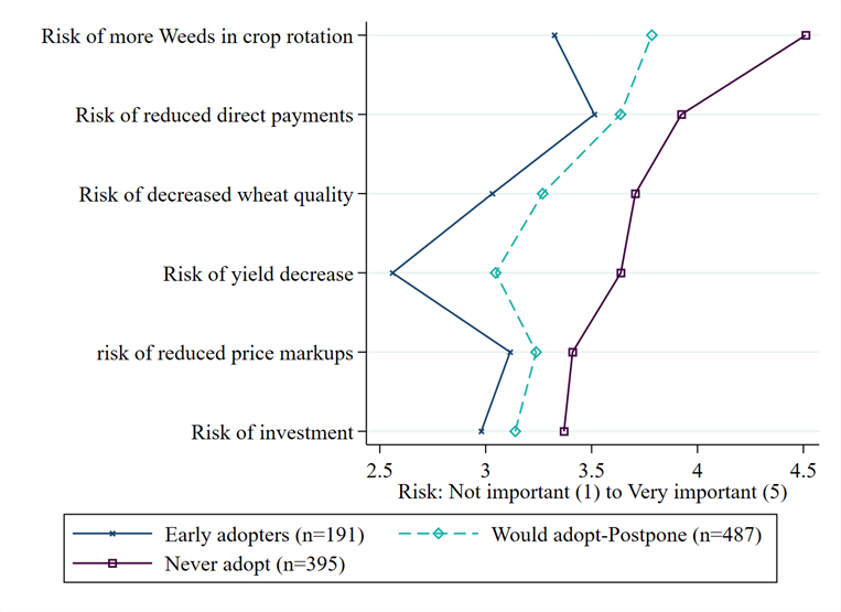Abbildung 1 zeigt die durchschnittlichen wahrgenommenen Risikolevel für jeden der Risikobereiche unter drei Gruppen von Landwirten und Landwirtinnen: i) die früh (d.h. in der Anbausaison 2019/20) auf pestizidfreie Weizenproduktion umgestellt haben N=191), ii) denen, die angeben später umstellen zu wollen (N=487), und iii) denen die gar nicht umstellen wollen (N=395).