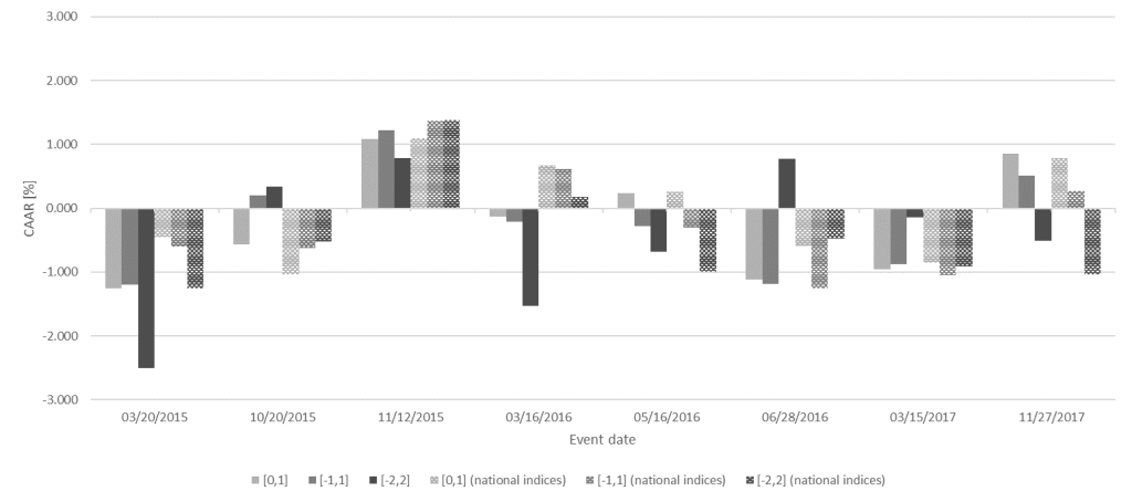 Diese Effekte auf die Aktienkurse sind gering, wenn man sie z.B. mit denen von Gerüchten über Ankündigungen von Fusionen und Übernahmen vergleicht. Beispielsweise führte am 9. Dezember 2015 das Gerücht über eine Fusion zwischen Dow Chemical und DuPont dazu, dass der Aktienkurs von Dow am selben Tag um 11% stieg (abnormale Rendite von 12,990%), was im Einklang mit früheren Studien zu Ankündigungen von Fusionen und Übernahmen steht (siehe z.B. Lamprinakis und Fulton, 2011; Liargovas und Repousis, 2011; Yoo et al., 2013). Selbst wenn man unsere Studie mit Forschung zu den Auswirkungen politischer Ereignisse auf private Unternehmen vergleicht, sind die in unseren Schätzungen ermittelten Auswirkungen vergleichsweise gering. So finden Bushnell et al. (2013) in ihrer Analyse der Auswirkungen der CO2-Preisregulierung in der EU kumulative durchschnittliche abnormale Renditen von -1,11% bis -3,2% für energieintensive Industrien bei einer Senkung des CO2-Preises und kumulative durchschnittliche abnormale Renditen von -5,6% bis 9,6% bei einem Anstieg der Preise für CO2-Emissionszertifikate. Johannesen und Larsen (2016) untersuchen die Auswirkungen des politischen Entscheidungsprozesses über eine länderweise Offenlegung der Steuerzahlungen für Unternehmen in der Rohstoffindustrie in Europa (Öl, Gas, Bergbau) und schätzen die kumulativen durchschnittlichen abnormalen Renditen zwischen -6% und 1,1%.