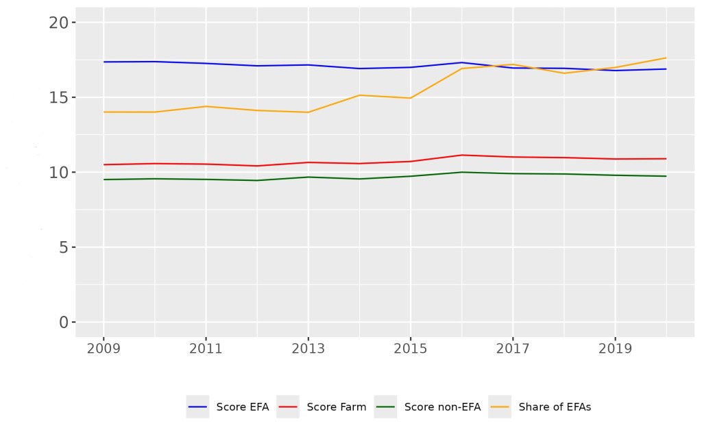 Les données fournies par 410 exploitations de 2009 à 2020 ont été utilisées pour l’analyse. Dans le cadre de leur participation au Dépouillement centralisé des indicateurs agro-environnementaux (DC-IAE), ces exploitations ont documenté de manière détaillée leurs différentes pratiques agricoles, telles que l’application de différents produits phytosanitaires, pour chaque parcelle. Ainsi, un score de biodiversité a pu être calculé sur la base de ces données et d’une méthode déjà développée auparavant par Agroscope pour évaluer l’effet potentiel des pratiques agricoles sur la biodiversité (Jeanneret et al., 2014). Figure 1 montre l’évolution de ce score entre 2009 et 2020. Ce score reflète l’effet potentiel bénéfique de ces pratiques en termes de diversité totale en espèces pour différents groupes d’espèces indicatrices (dont, par exemple, les amphibiens et les mammifères).