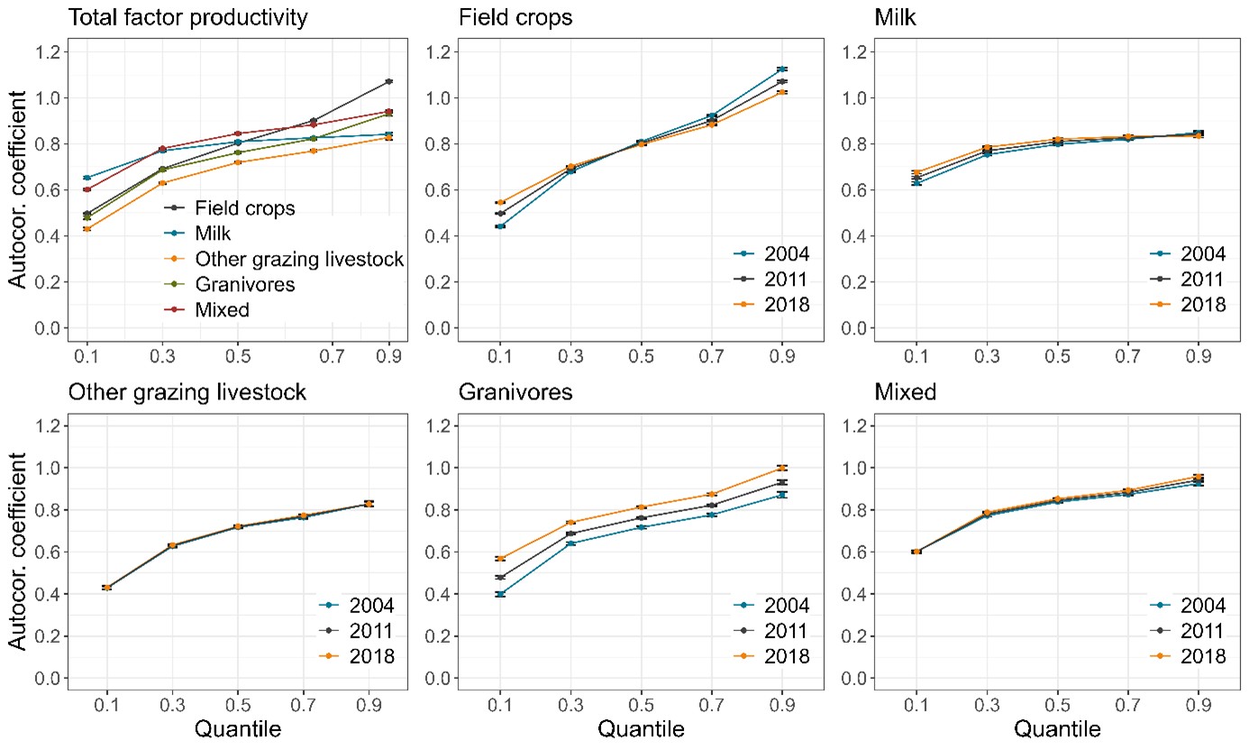 Zur Beurteilung der Stabilität wurde die Persistenz der Totalen Faktorproduktivität quantifiziert, d.h. wie stark diese (und ihre Komponenten) auf einzelbetrieblicher Ebene von Jahr zu Jahr schwankt. Eine hohe Persistenz deutet auf eine hohe Widerstandsfähigkeit gegenüber externen Schocks hin (Slijper et al. 2022), sie ist insbesondere in Kombination mit der Totalen Faktorproduktivität zielführend. Für weniger produktive Betriebe kann eine hohe Persistenz bedeuten, dass sie sich in einer wirtschaftlich ungünstigen Situation befinden und diese nicht verlassen. Wir haben daher nicht nur die durchschnittliche Persistenz über alle Betriebe analysiert, sondern diese Analyse für produktive und unproduktive Betriebe getrennt durchgeführt.