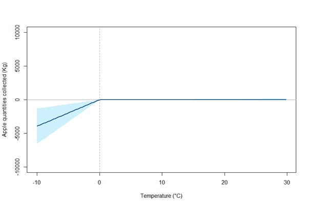 Die Ergebnisse zeigen, dass bei Apfelbäumen, die ungewöhnlich tiefen Temperaturen ausgesetzt sind, jede Stunde Frost bei jedem Grad unter 0 °C zu einem Verlust von 394 kg Äpfeln führt. Ein Beispiel: Eine Stunde bei minus 5 °C entspricht einem Verlust von 1 970 kg Äpfeln, was dem Verlust von fünf Stunden bei minus 1 °C entspricht.